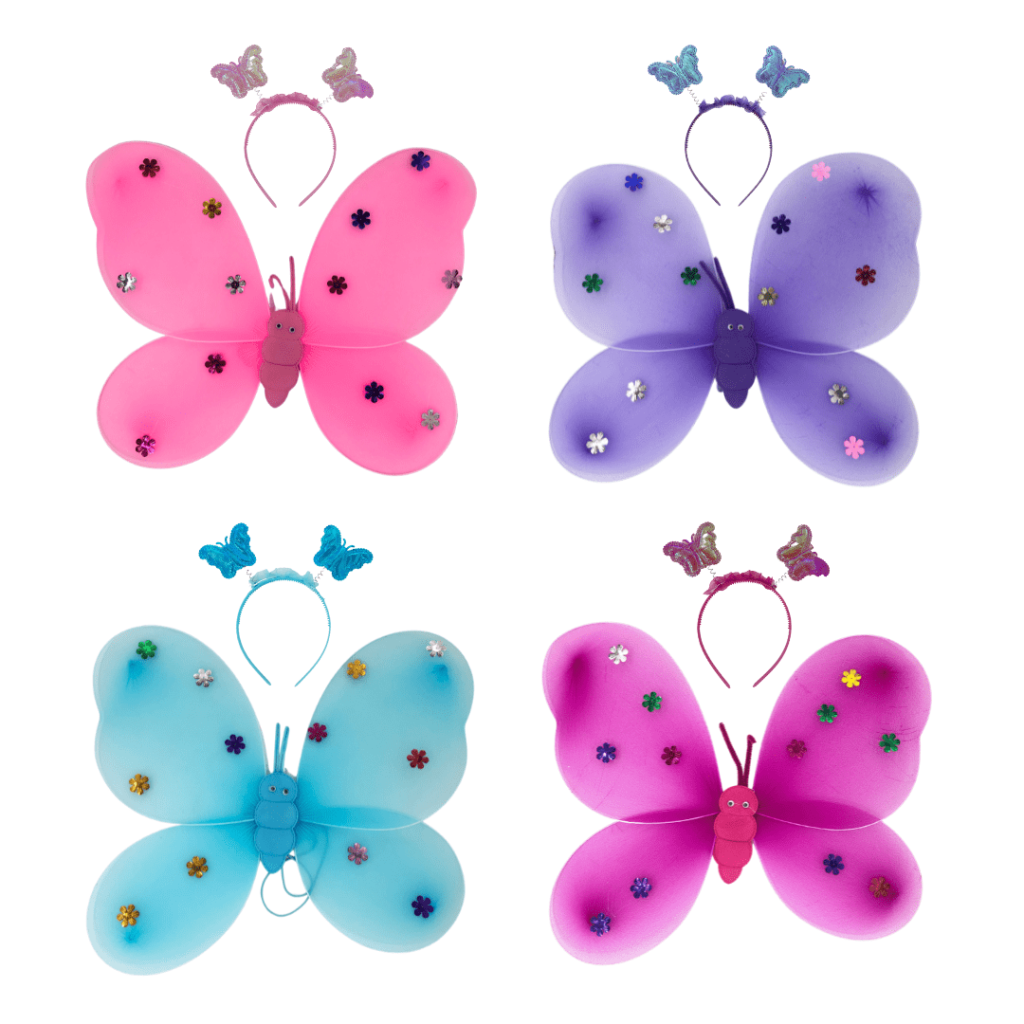 Nuestros conjuntos de alas de mariposa con varita están diseñados para transformar cualquier momento en una experiencia mágica. Cada set incluye: